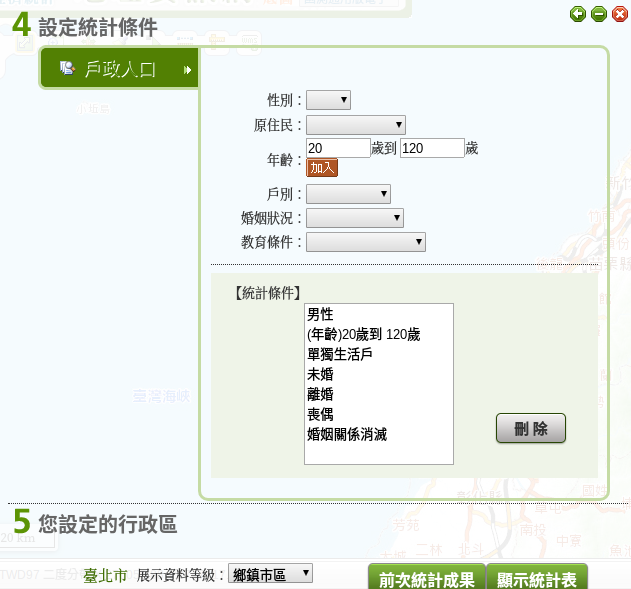 接著我們要輸入一些條件,【男性】、【單獨生活戶】是少不掉的,再來婚姻狀況就把除了【有偶】之外全部選起來,年紀就算20-120歲吧,按下加入。就會變成下面的樣子: